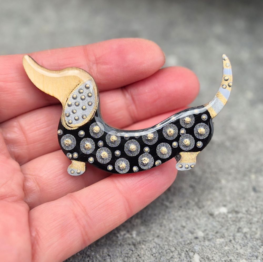 Velikost70 x 38 mmDetajliZlate in kovinske pike, zlate črteMaterialiles, epoksi smola, varnostno zapenjanje broške – nerjaveče jekloVzdrževanječiščenje s suho krpo